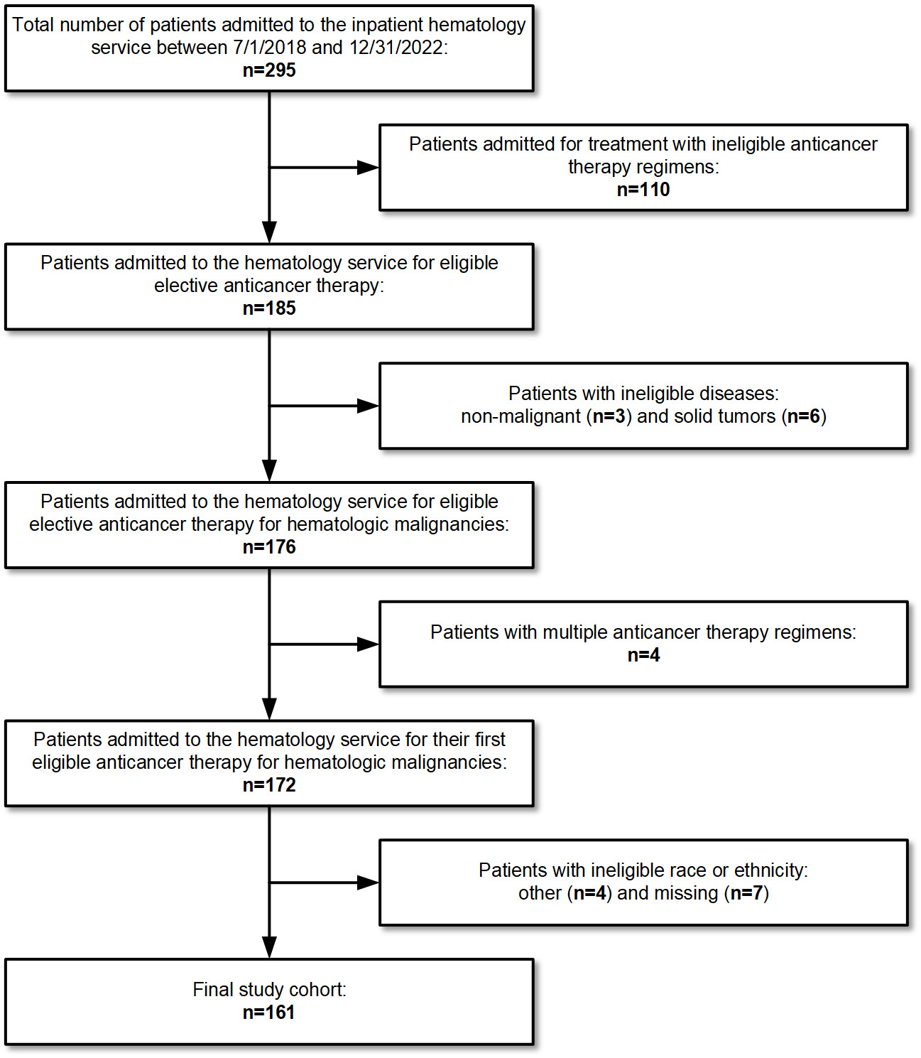 Anticancer therapy regimens were dichotomized as fixed-duration and variable-duration. Fixed-duration regimens were those in which treatment was administered over a predetermined number of days and in which the inpatient stay duration was determined by this schedule. These regimens included high-dose cytarabine and dexamethasone with either cisplatin or oxaliplatin (DHAP/DHAX; 2 days); ifosfamide, carboplatin, and etoposide (ICE; 3 days); etoposide, vincristine, doxorubicin, cyclophosphamide, and prednisone (EPOCH; 5 days); and high-dose cytarabine (HIDAC; 5 days). Variable-duration regimens were those for which inpatient stay duration varied according to metabolite clearance, tumor lysis syndrome monitoring, or white blood cell count recovery. These included high-dose methotrexate (HD-MTX), HyperCVAD7 (due to incorporation of high-dose methotrexate in alternating cycles), liposomal daunorubicin and cytarabine (CPX-351), and venetoclax-based regimens.
