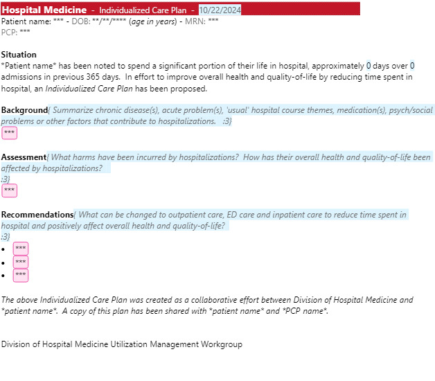 Selected patients were reviewed and discussed within the group, with input sought from additional care team members (e.g., primary care provider, specialists, nursing, etc.) when indicated. An individualized care plan (ICP) was then developed for twelve patients in this project’s initial phase (Figure 1). ICPs were documented in a standardized fashion using a newly created note template. The note template used rule-based tools to auto-populate the number of admissions and days in hospital over the previous 365 days. The template also used “vanishing tips” to help guide documentation in SBAR format (i.e., situation, background, assessment, recommendations); the tips were automatically removed upon note signature (Figure 2).