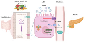 It is well known that enteroendocrine cells produce low basal levels of GLP-1 during pre-prandial state, however after food ingestion the synthesis and secretion of GLP-1 sharply raises with a peak 30–60 min following nutrient intake.24,25,28 The L-cell’s apical surface faces the gut lumen, allowing direct contact with nutrients. Molecules like glucose, fructose, and galactose stimulate the synthesis of GLP-1 by closing ATP-sensitive K+ channels. This closure causes membrane depolarization, which opens voltage-dependent calcium channels. The influx of calcium then activates proteases that cleave proglucagon peptides, ultimately boosting GLP-1 production.27 Importantly, GLP-1 action is short-lived, with a half-life of just 1–2 minutes in the bloodstream under normal physiological conditions, after which it is broken down by the enzyme dipeptidyl peptidase IV (DPP-4), resulting in a loss of its biological activity.24,25 The mechanisms of regulation and synthesis for GLP-1secretion are summarized in Figure 1.