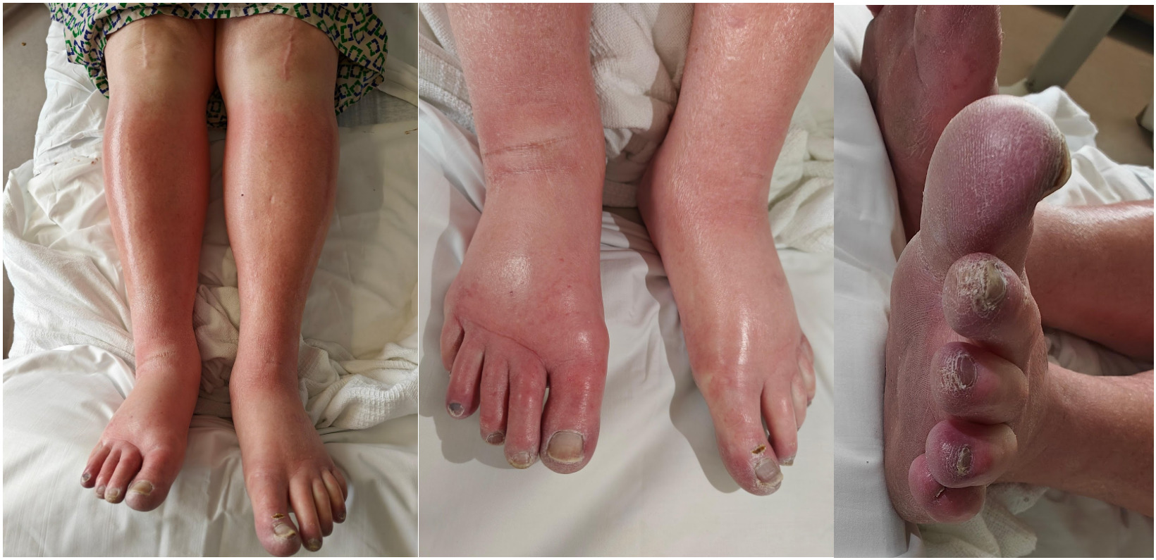 A woman in her mid-70s arrived at the hospital three weeks after undergoing rotator cuff surgery, reporting worsening bilateral leg pain accompanied by swelling, redness in her legs, and purple discoloration of her toes. Her past medical history included hypertension, hyperlipidemia, osteoarthritis, gastroesophageal reflux disease secondary to a sliding hiatal hernia status post-repair, and idiopathic erythromelalgia. Since her diagnosis three years ago, she has had frequent erythromelalgia flares characterized by erythema, pain, and paresthesias on her feet, hands, and face. Prior to her admission, the patient had reached out to her primary care provider, who prescribed loop diuretics and antibiotics to treat the bilateral leg edema and erythema without clinical improvement noted.
