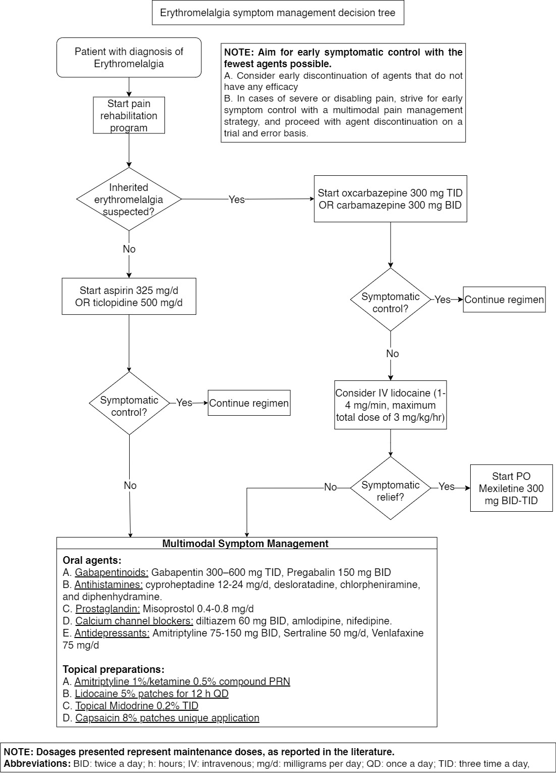 The management of Erythromelalgia is complex, virtually limited to pain relief, and often requires a multimodal strategy with multiple agents to achieve symptomatic control.12 A state-of-the-art review recommends a stepwise approach to trial pharmacotherapy.12 For patients with inherited erythromelalgia, oxcarbazepine or carbamazepine can be used.12 If either proves ineffective, lidocaine infusion followed by mexiletine may provide relief.12 Additional treatment with gabapentin may be considered with the aim of treating central causes of pain.12