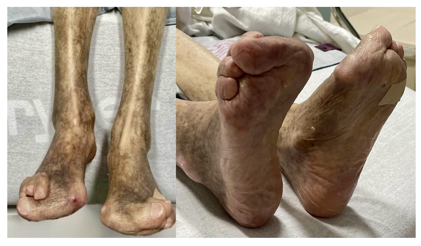 On exam, he had mild dyspnea and cachexia with bitemporal and extremity muscle wasting. His hands showed multiple chronic deformities, including wrist fusion, elbow flexion contractures, Z-shaped thumbs, and swan neck deformities. His feet showed bilateral, severe hallux valgus and multiple hammertoe and claw toe deformities. Weight-bearing radiographs of his feet (Figure 2) and legs confirmed bilateral hallux valgus, moderate bilateral first metatarsophalangeal osteoarthritis, and erosive irregularities of the first and fifth metatarsal heads concerning for erosive rheumatoid arthropathy. Diffuse bony demineralization and bilateral hammertoes were present. A right tibial intramedullary rod and right lateral distal fibular plate with Lack screws in the distal tibia and fibula, consistent with right ankle fusion, was noted.