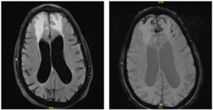 A CT brain was performed in the emergency department, which showed vasogenic edema in the bilateral frontal lobes with trace subarachnoid hemorrhage and hemorrhagic contusion in the right frontal lobe. A repeat CT performed six hours later showed no interval change. The patient was subsequently admitted, and both neurosurgery and neurology were consulted. They recommended initiating IV dexamethasone for vasogenic edema and IV levetiracetam for seizure prophylaxis. A routine EEG showed diffuse theta background slowing, suggesting an underlying mild to moderate diffuse encephalopathy without focal epileptiform discharges. An MRI of the brain was performed, which showed bifrontal vasogenic edema with both superficial siderosis and microhemorrhages, consistent with cerebral amyloid angiopathy-related inflammation (CAA-RI) (Figure 1).