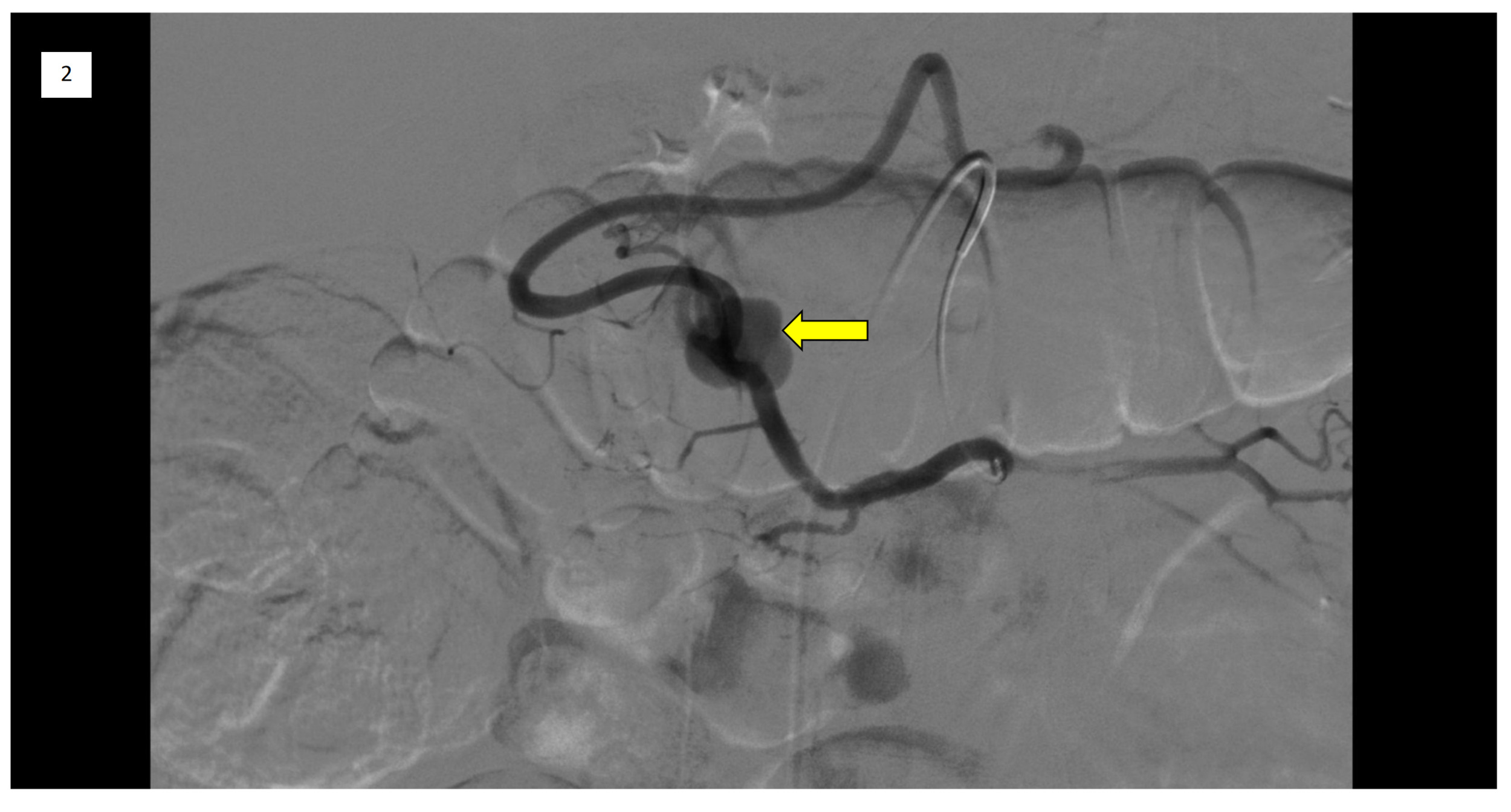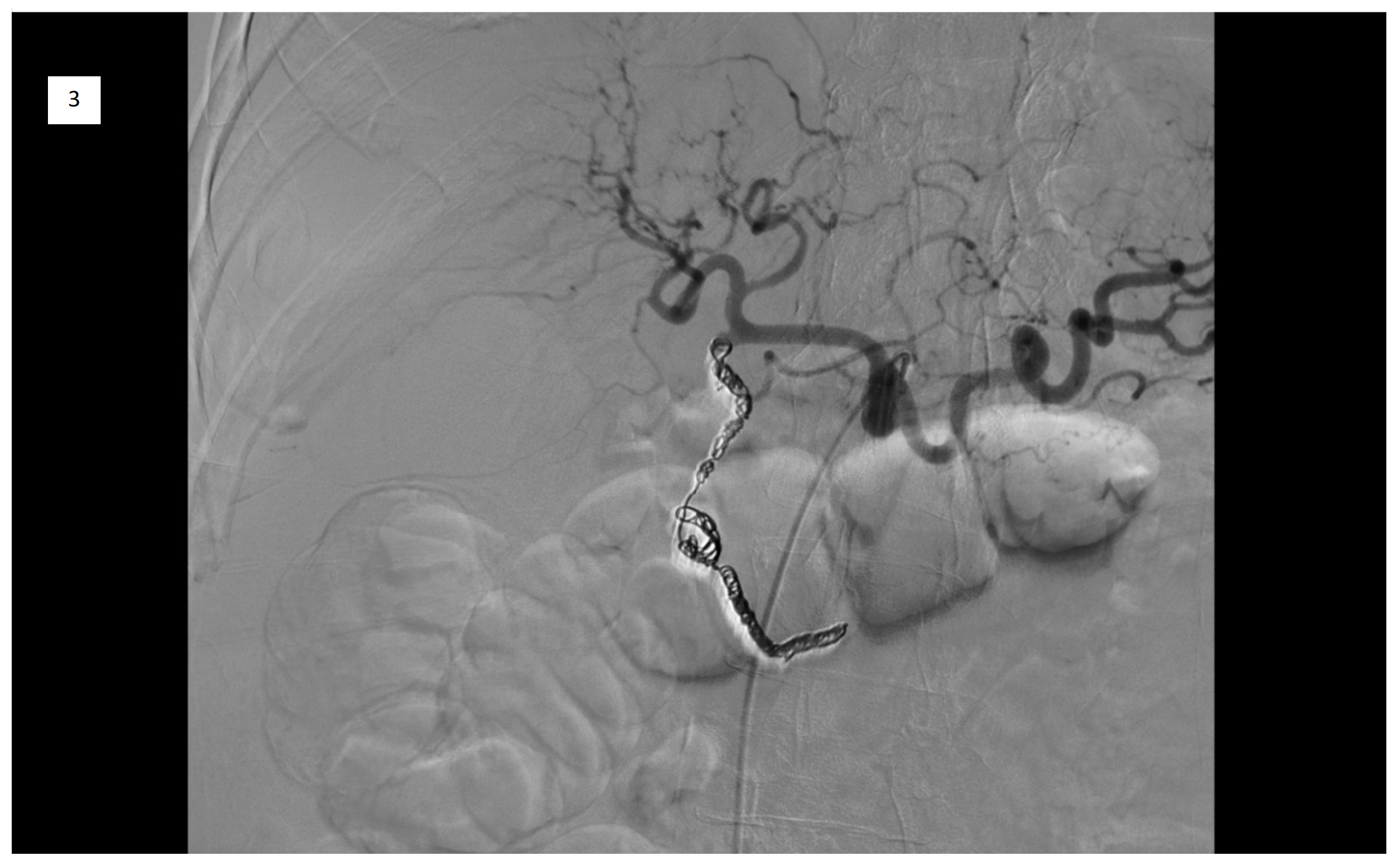 On day 2, an emergency Celiac artery angiography was performed by Interventional Radiology, which demonstrated a patent GDA with delayed and faint filling of a pseudoaneurysm centered in the GDA territory. The angiograms of the superior mesenteric artery (SMA) and the inferior pancreaticoduodenal artery (IPDA) demonstrated brisk filling of a large pseudoaneurysm in the GDA territory (Figure 2) and an additional, much smaller pseudoaneurysm more distally with a large feeding vessel from the IPDA. Subsequently, micro-catheterization of the SMA and retrograde catheterization of the proximal GDA were performed. Due to difficulties in deploying POD 6 and POD 4 coils, coil embolization was ultimately performed using multiple detachable and soft coils appropriately sized to the target vessels. Post-embolization angiography from IPDA demonstrated successful occlusion of the GDA and the large pseudoaneurysm, as well as that of large feeding vessels to the smaller pseudoaneurysm (Figure 3). A follow-up CT scan on day 3 confirmed resolution of the pseudoaneurysm and a stable hematoma.