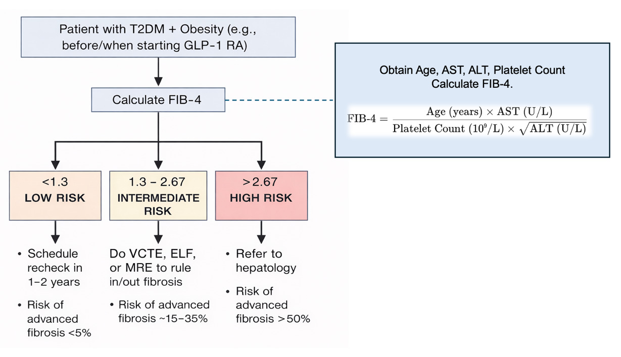 A 52-year-old man with long-standing type 2 diabetes mellitus (T2DM), obesity (BMI 36 kg/m²), and hypertension was followed in a primary care clinic for suboptimal glycemic control. He was initiated on a glucagon-like peptide-1 receptor agonist (GLP-1 RA), resulting in substantial weight loss and improvement in hemoglobin A1c. Over the following year, his liver enzymes remained mildly elevated but stable, prompting no further evaluation. Eighteen months later, he presented with ascites and upper gastrointestinal bleeding and was diagnosed with decompensated cirrhosis due to metabolic dysfunction–associated steatotic liver disease (MASLD). Retrospective review revealed that his fibrosis-4 (FIB-4) score had exceeded high-risk thresholds before GLP-1 therapy initiation, yet no fibrosis risk stratification had been performed.