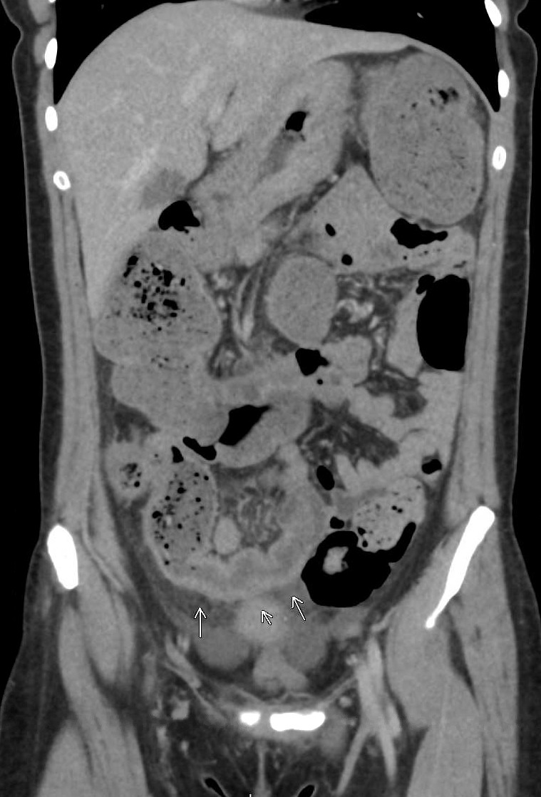 On presentation, her temperature was 98.5°F, blood pressure 105/71 mmHg, heart rate 86 beats/min, respiratory rate 18 breaths/min, and oxygen saturation 98% on room air. She appeared thin and chronically ill. Abdominal examination was notable for diffuse tenderness and hyperactive bowel sounds, without rebound, guarding, or other peritoneal signs. There were no clinical stigmata of portal hypertension, including ascites on examination, splenomegaly, palmar erythema, or spider angiomata. Initial laboratory evaluation demonstrated microcytic anemia, with hemoglobin 9.2 g/dL (reference range, 12-16 g/dL), hematocrit 29.6% (36-46%), and mean corpuscular volume 70 fL (80-100 fL). The white blood cell count was 7.3 × 10³/μL (4-11 × 10³/μL), and the platelet count was 374 × 10³/μL (150-400 × 10³/μL). Iron studies were notable for ferritin 8.3 ng/mL (15-150 ng/mL). C-reactive protein was 3.3 mg/L (<5 mg/L). The comprehensive metabolic panel showed sodium 137 mmol/L (136-145 mmol/L), potassium 3.3 mmol/L (3.5-5.1 mmol/L), creatinine 0.6 mg/dL (0.6-1.2 mg/dL), and albumin 4.3 g/dL. Liver panel was within normal limits, including alanine aminotransferase 9 U/L (7-56 U/L), aspartate aminotransferase 13 U/L (10-40 U/L), alkaline phosphatase 70 U/L (45-115 U/L), and total bilirubin 0.5 mg/dL (0.1-1.2 mg/dL).