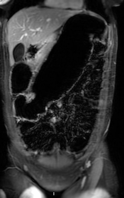 Magnetic resonance enterography on hospital day 7 confirmed mural thickening and luminal narrowing of the descending colon with upstream distension, findings suggestive of a chronic stricture (Figure 1C). Moderate-volume pelvic ascites was also present, although there were no imaging features of portal hypertension. An extensive infectious and inflammatory evaluation, including stool cultures, ova and parasite examination, celiac serologies, tuberculosis testing, and serologic testing for Entamoeba histolytica, was unrevealing. Although ascites was present, no safe fluid pocket was available for diagnostic paracentesis. Because of progressive obstructive symptoms, worsening colonic dilation, and persistent diagnostic uncertainty despite extensive noninvasive evaluation, laparoscopic-assisted subtotal colectomy was performed on hospital day 8. Empiric immunosuppressive therapy for Crohn’s disease was deferred throughout the evaluation because of the absence of classic endoscopic features of inflammatory bowel disease and concern for an alternative diagnosis. Intraoperatively, multiple colonic strictures, adhesions involving the pancreas and spleen, mesenteric lymphadenopathy, and diffuse gastric wall thickening were identified.