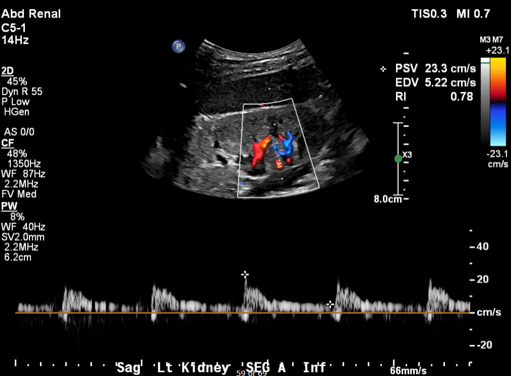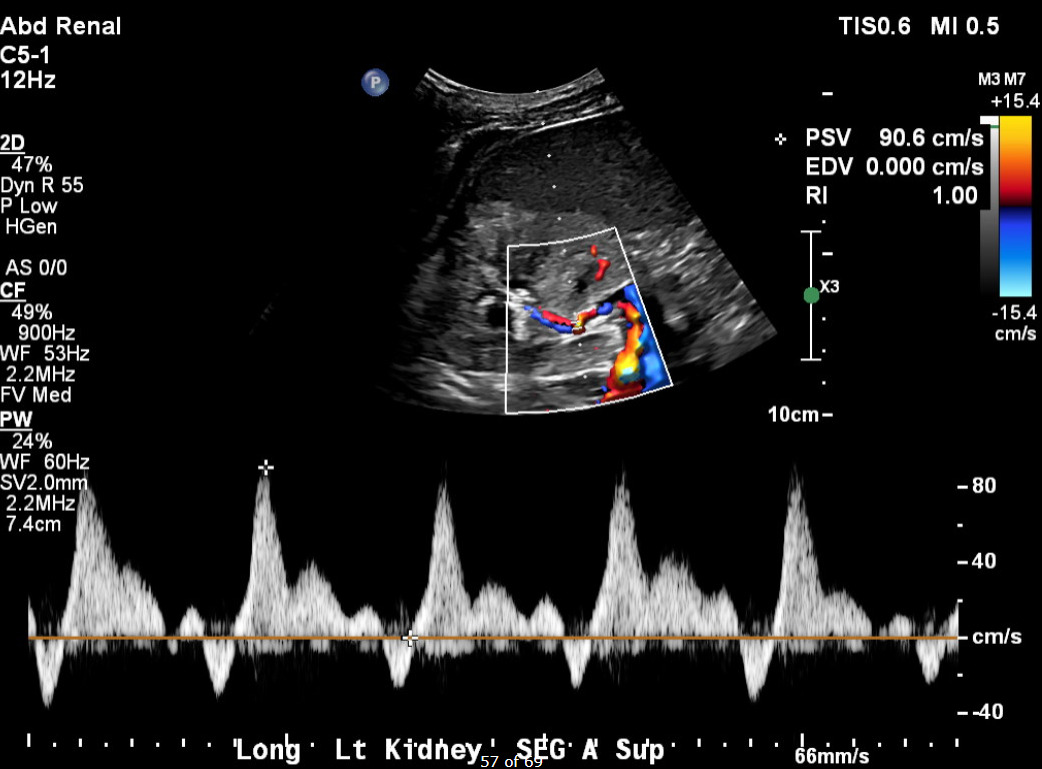 Her current presentation was characterized by a one-week history of worsening dyspnea, orthopnea, and paroxysmal nocturnal dyspnea. On arrival, her blood pressure was 257/169 mmHg, with tachypnea and bilateral inspiratory crackles on examination. Initial laboratory studies (Table 1) demonstrated serum creatinine 5.36 mg/dL, BUN 74 mg/dL, hemoglobin 8.2 g/dL, NT-proBNP >35,000 pg/mL, and high-sensitivity troponin T 93 ng/L, consistent with demand ischemia in the setting of hypertensive emergency. Urinalysis revealed 3+ proteinuria. Chest radiography demonstrated bilateral interstitial and alveolar opacities consistent with pulmonary vascular congestion. A transthoracic echocardiogram obtained during this admission demonstrated preserved LVEF (56–60%), severe concentric left ventricular hypertrophy, and grade I diastolic dysfunction. Renal duplex ultrasonography demonstrated bilaterally echogenic kidneys consistent with medical renal disease. Doppler interrogation of a segmental branch supplying the upper pole of the left kidney demonstrated elevated peak systolic velocity (~90.6 cm/s), absent end-diastolic flow (end-diastolic velocity 0.0 cm/s), and a markedly elevated resistive index (RI = 1.0) (Figure 1), findings which may suggest severe intrarenal hemodynamic compromise and a probable functionally significant focal upper-pole segmental renal artery stenosis. Flow velocities in the main renal arteries and other segmental branches were within normal limits (Figure 2). Computed tomographic angiography was not performed due to advanced renal dysfunction. Magnetic resonance angiography was also considered; however, it was not pursued during this hospitalization because additional imaging was unlikely to alter immediate management, particularly in the setting of advanced chronic kidney disease and the patient’s preference to avoid renal replacement therapy.
