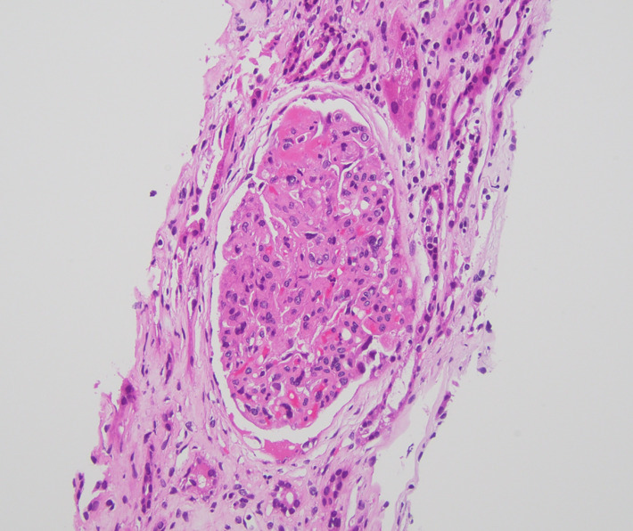 The following day, hemoglobin decreased to 8.8 g/dL and platelets to 53 ×10^3/µL. Direct antiglobulin (Coombs) testing was negative. ANA testing was negative and complement C3/C4 levels were within reference ranges. Peripheral smear demonstrated schistocytes. Hematology assessed a low likelihood of TTP given a PLASMIC score of 3 and ADAMTS13 activity of 51% (not severely reduced). Given persistent AKI with suspected TMA, the nephrology team proceeded with a right kidney biopsy. Biopsy demonstrated acute thrombotic microangiopathy involving glomeruli and small-to-medium vessels, with tubular atrophy/interstitial fibrosis and severe arterio- and arteriolosclerosis (Figure 1). Key diagnostic findings are summarized in Table 1, and relevant laboratory findings are provided in the supplementary material. Blood pressure normalized with nifedipine 60 mg daily and carvedilol 25 mg twice daily.