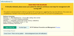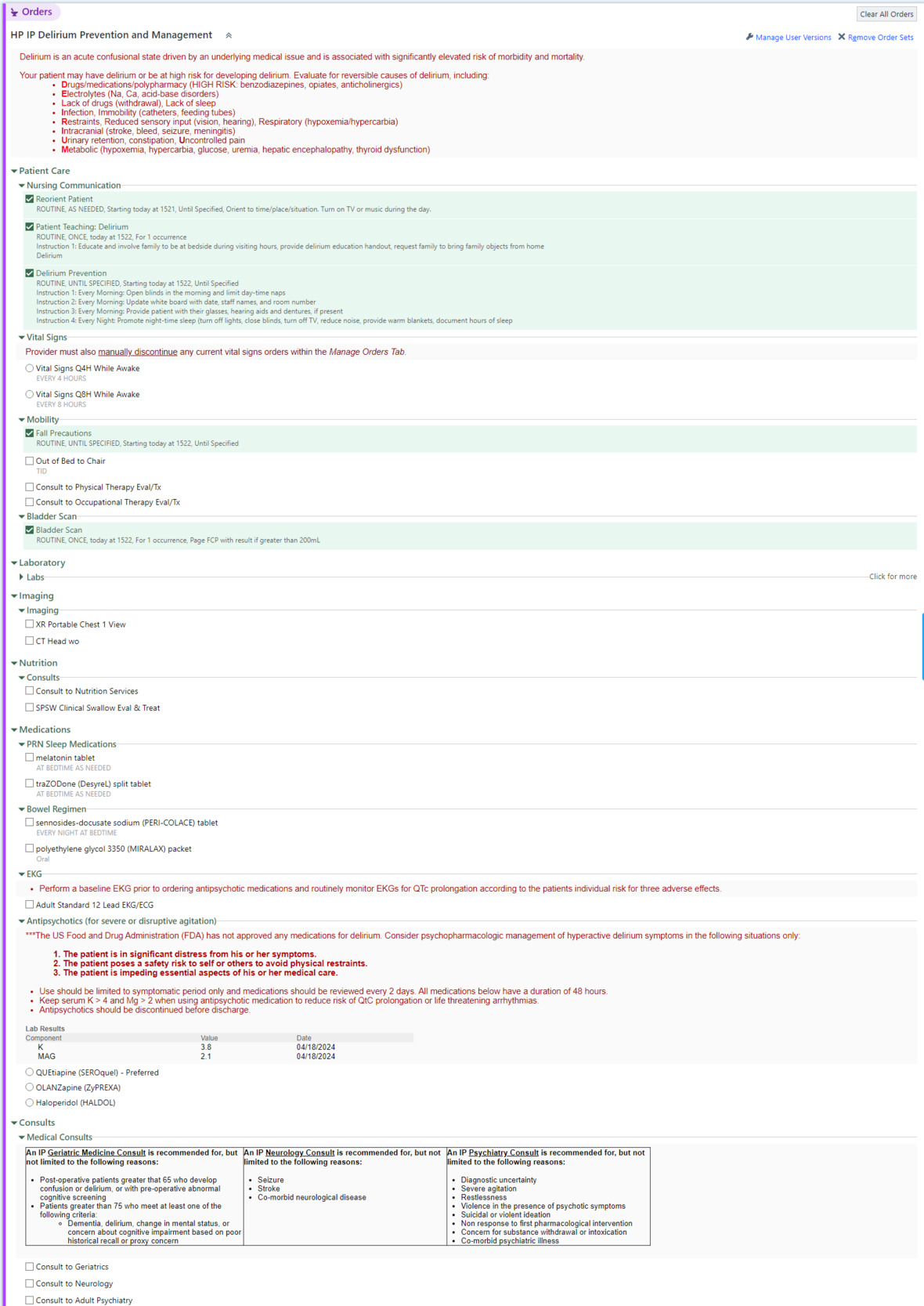 To optimize delirium management at our institution, we implemented a clinical decision support system (CDSS) within our Epic (Verona, Wisconsin, USA) electronic medical record (EMR). Our institution previously integrated routine universal delirium screening into nursing workflow, using the 4 A’s Test (4AT, assessing alertness, orientation, attention, acuteness, and fluctuation of change), enabling point-of-care alerts to physicians regarding a patient’s delirium risk.8 We introduced an Our Practice Advisory (OPA) and order set, triggered by a positive 4AT delirium risk score, designed to encourage high-value interventions and discourage unnecessary medication use or other low-value procedures. This study aims to evaluate the utilization of this intervention and its impact on encouraging adherence to evidence-based delirium management practices at our institution.